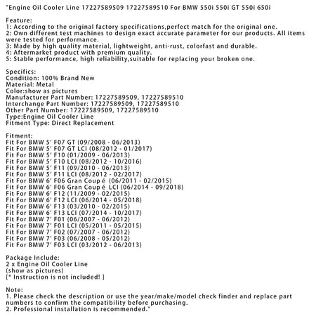 エンジンオイルクーラーライン 17227589509 17227589510 BMW 550i 550i GT 550i 650iに適合