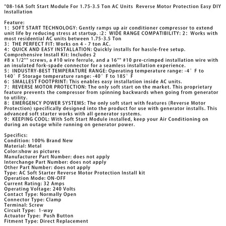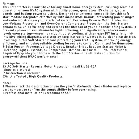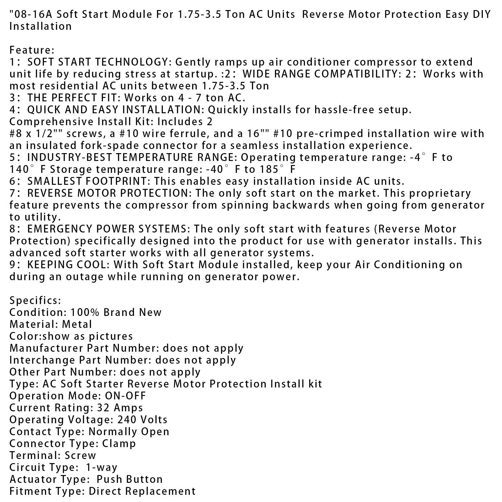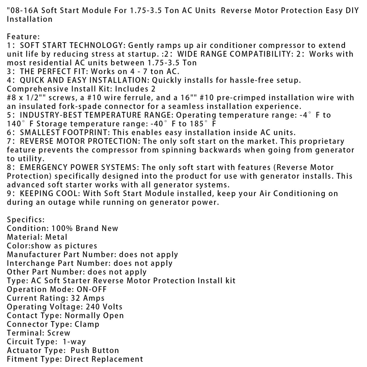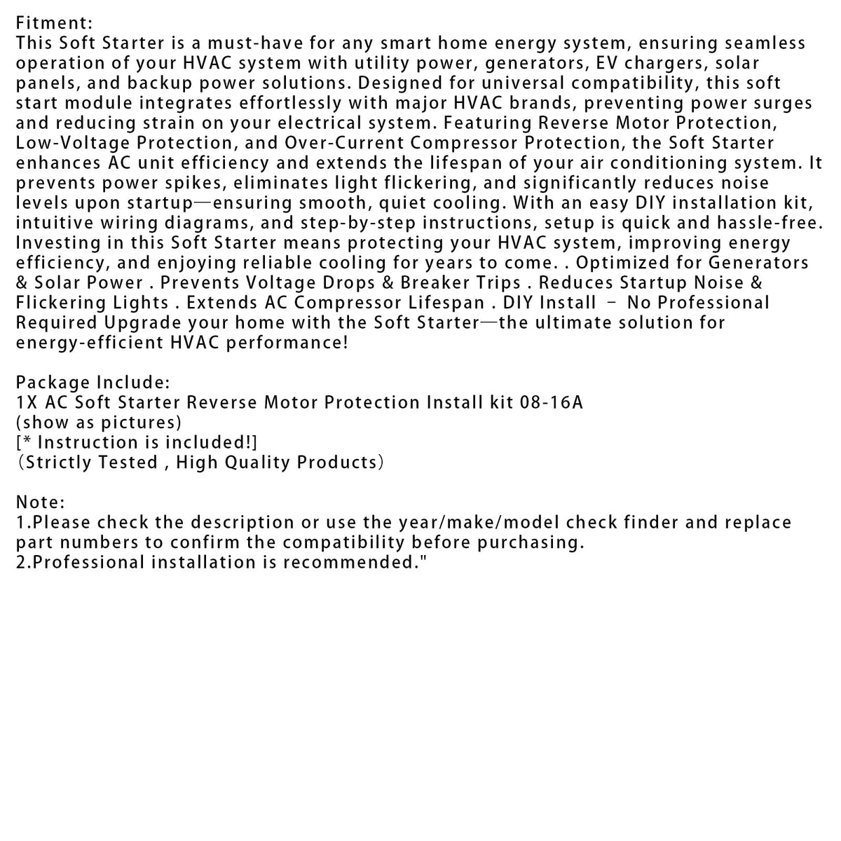 1:ソフトスタートテクノロジー:エアコンコンプレッサーを徐々に起動し、起動時のストレスを軽減することでユニットの寿命を延ばします。:2:幅広い互換性:2:1.75〜3.5トンのほとんどの住宅用ACユニットで動作します。
