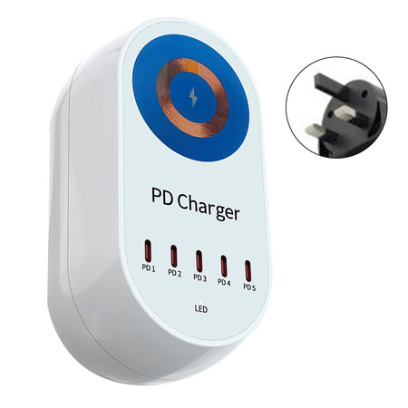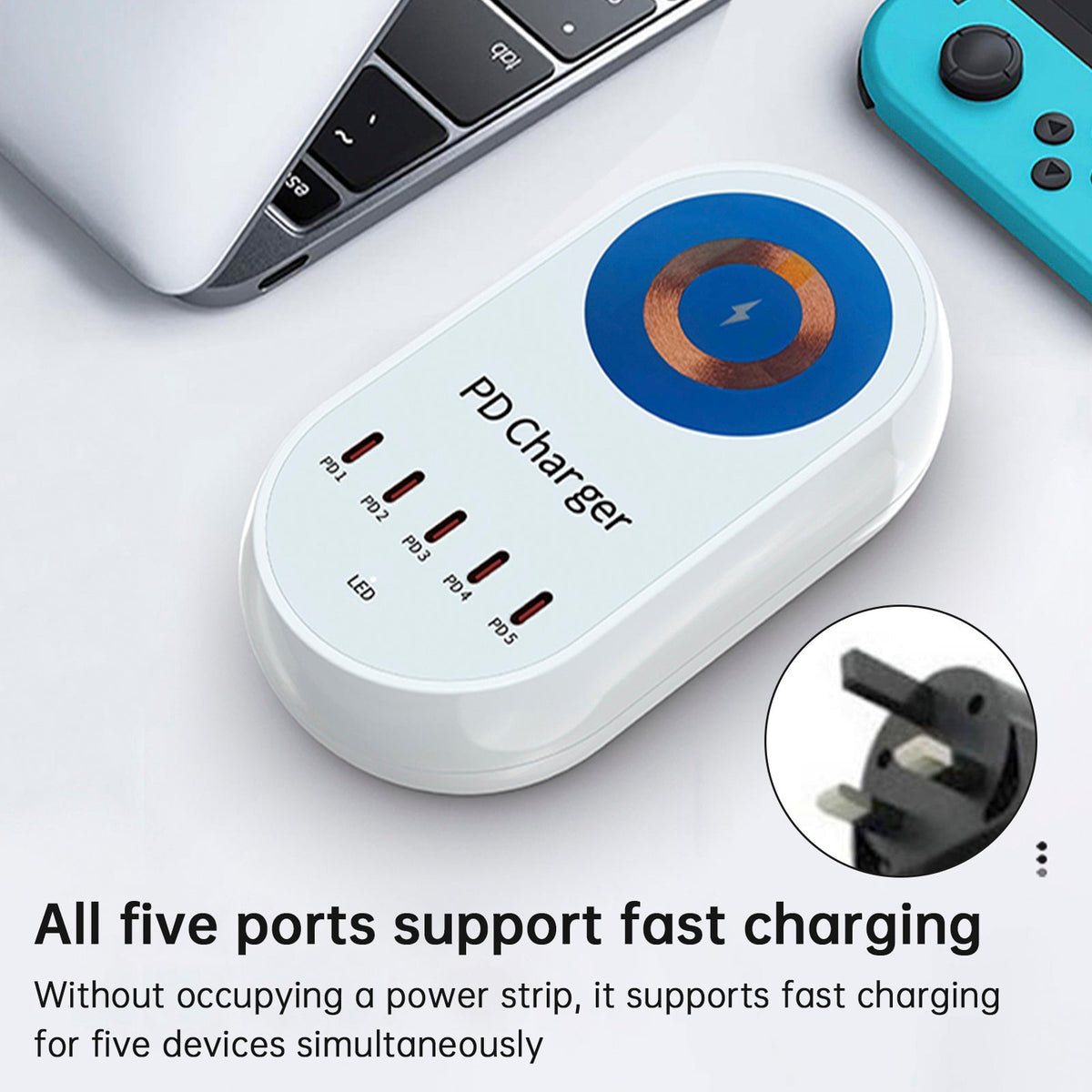 14.さまざまなデバイスと互換性があり、5つのPDポート+さまざまなデバイスと互換性のある1つのワイヤレス充電器は、さまざまなデバイス、携帯電話、タブレット、ノートブック、Bluetoothヘッドセットを充電できます。