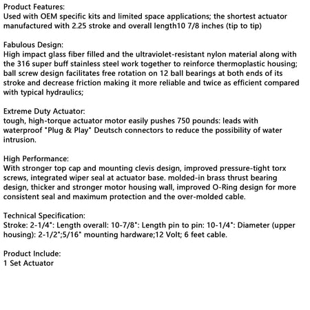 ストローク: 2-1/4""、全体の長さ: 10-7/8""、ピン間の長さ: 10-1/4""、直径 (上部ハウジング): 2-1/2""、5/16"" 取り付けハードウェア、12 ボルト、6 フィートのケーブル。
