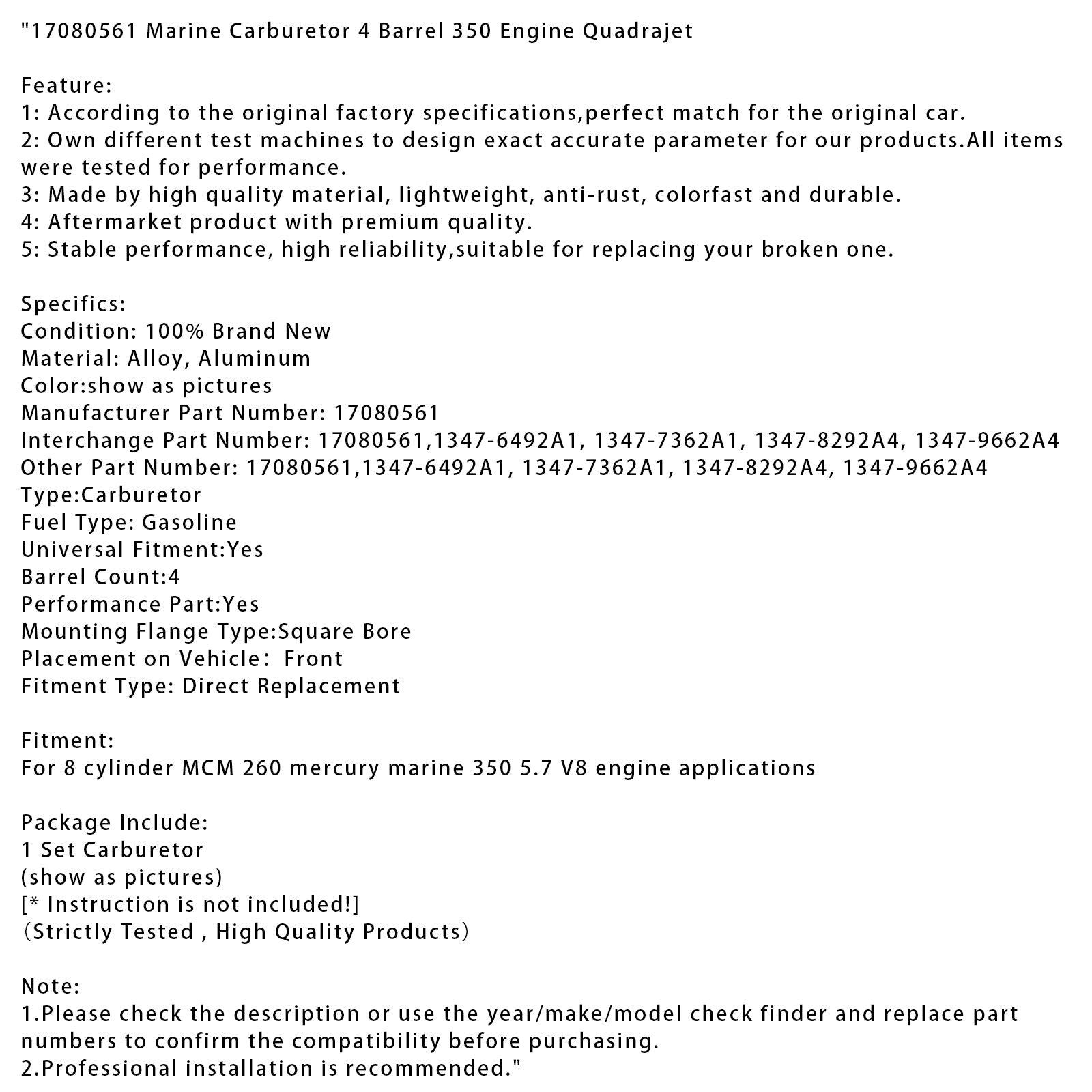 17080561 マリンキャブレター 4バレル 350 エンジン クアドラジェット