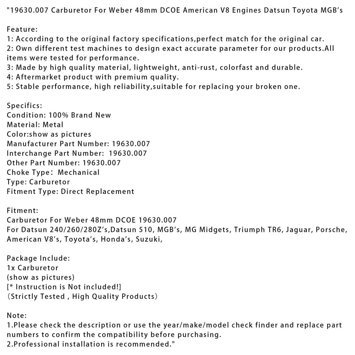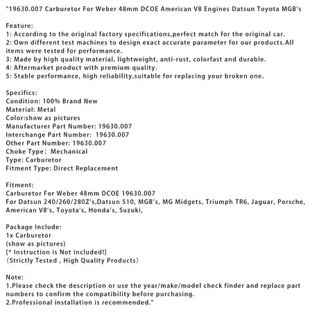 19630.007 ウェーバー 48mm DCOE アメリカン V8 エンジン用キャブレター ダットサン トヨタ