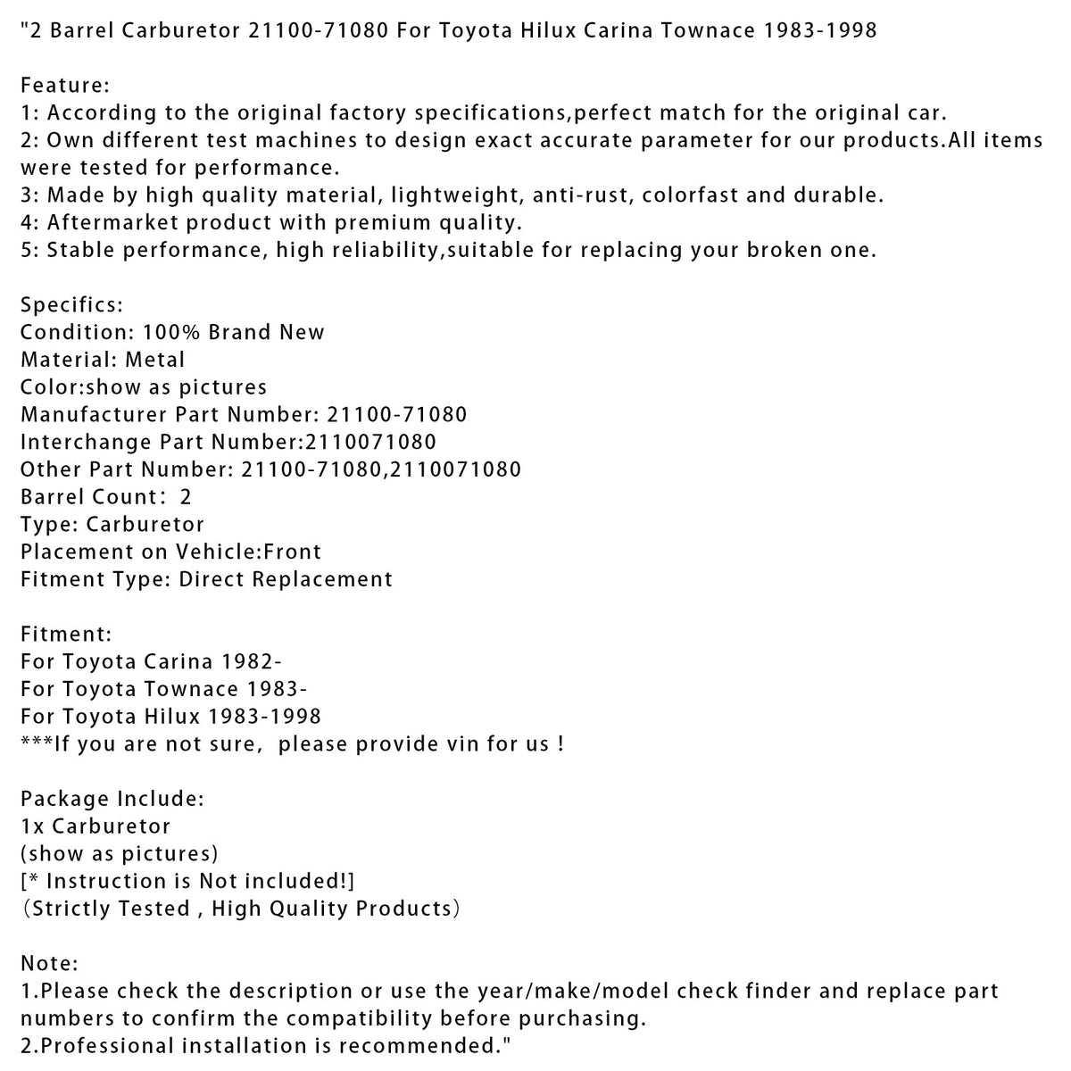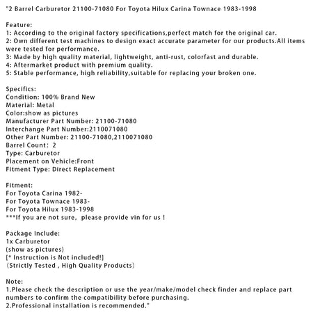 2バレルキャブレター 21100-71080 トヨタ ハイラックス カリーナ タウンエース 1983-1998年式用