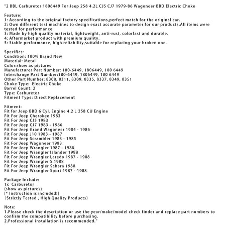 2 BBL キャブレター ジープ 258 4.2L CJ5 CJ7 1979-1986 ワゴニア BBD 電動チョーク 1806449