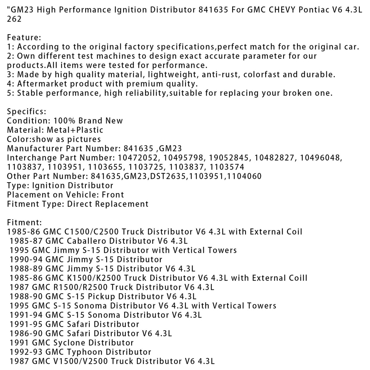 GM23 高性能イグニッションディストリビューター 841635 GMC CHEVY Pontiac V6 4.3L 262用