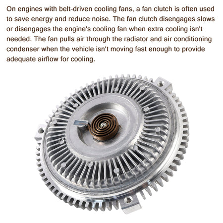 ベルト駆動の冷却ファンを備えたエンジンでは、エネルギーを節約し、騒音を減らすためにファン クラッチがよく使用されます。追加の冷却が必要ない場合、ファン クラッチはエンジンの冷却ファンを遅くしたり、切断したりします。車両が十分な空気の流れを冷却に提供できるほど速く移動していない場合は、ファンがラジエーターとエアコン コンデンサーを通して空気を引き込みます。