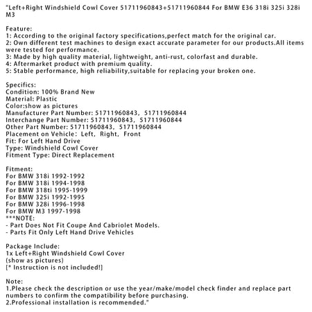 左+右フロントガラスカウルカバー 51711960843+51711960844 BMW E36 318i 325i 328i M3用
