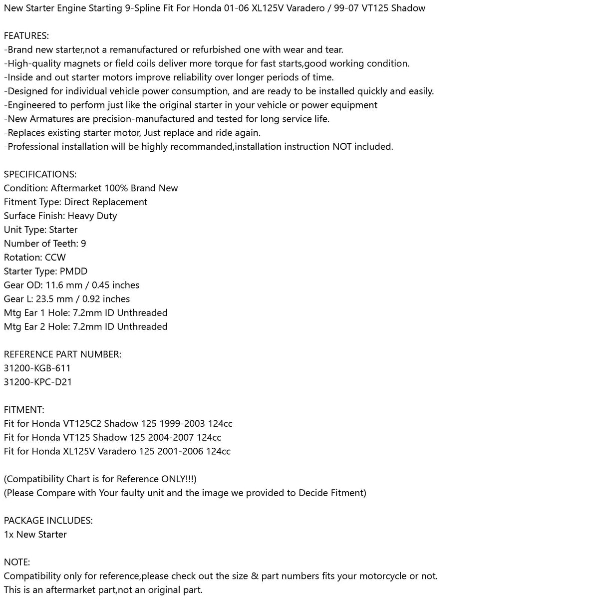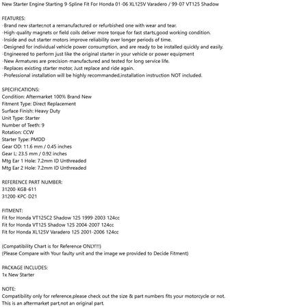 新しいスターターエンジンスターター9スプライン、ホンダ01-06 XL125Vバラデロ/99-07 VT125シャドウに適合