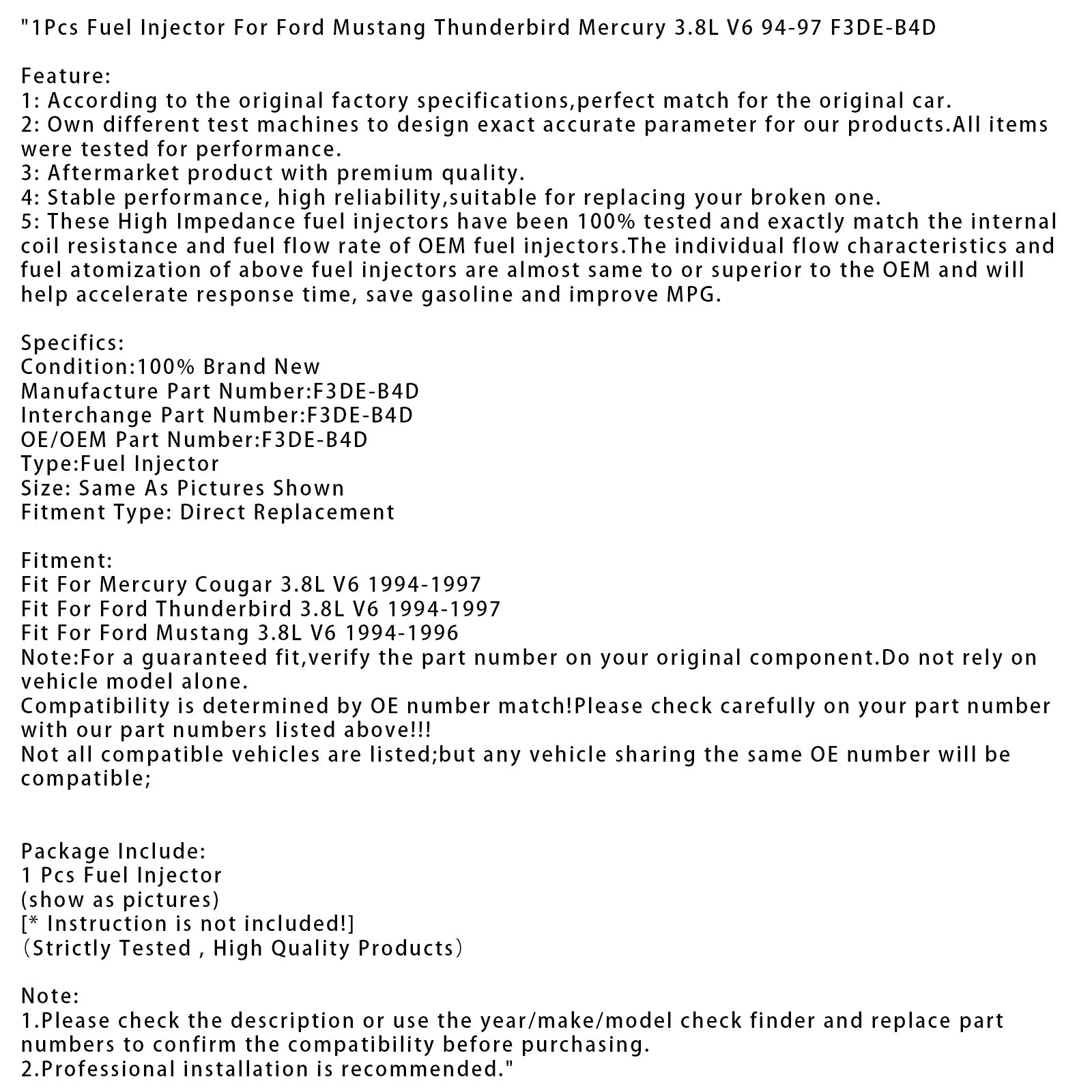 フォード マスタング サンダーバード マーキュリー 3.8L V6 94-97 F3DE-B4D 用燃料インジェクター 1個