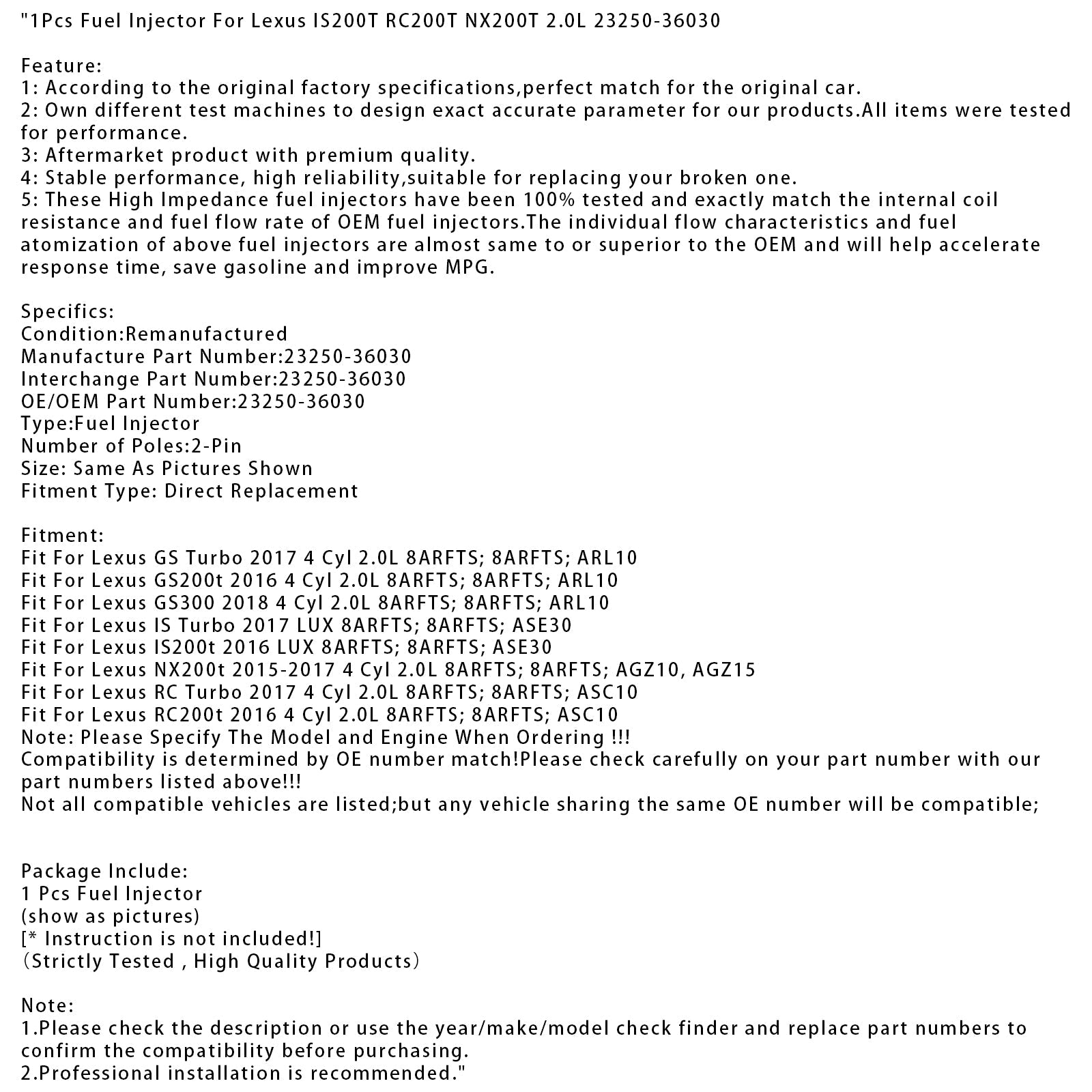 レクサス IS200T RC200T NX200T 2.0L 23250-36030 用燃料インジェクター 1個