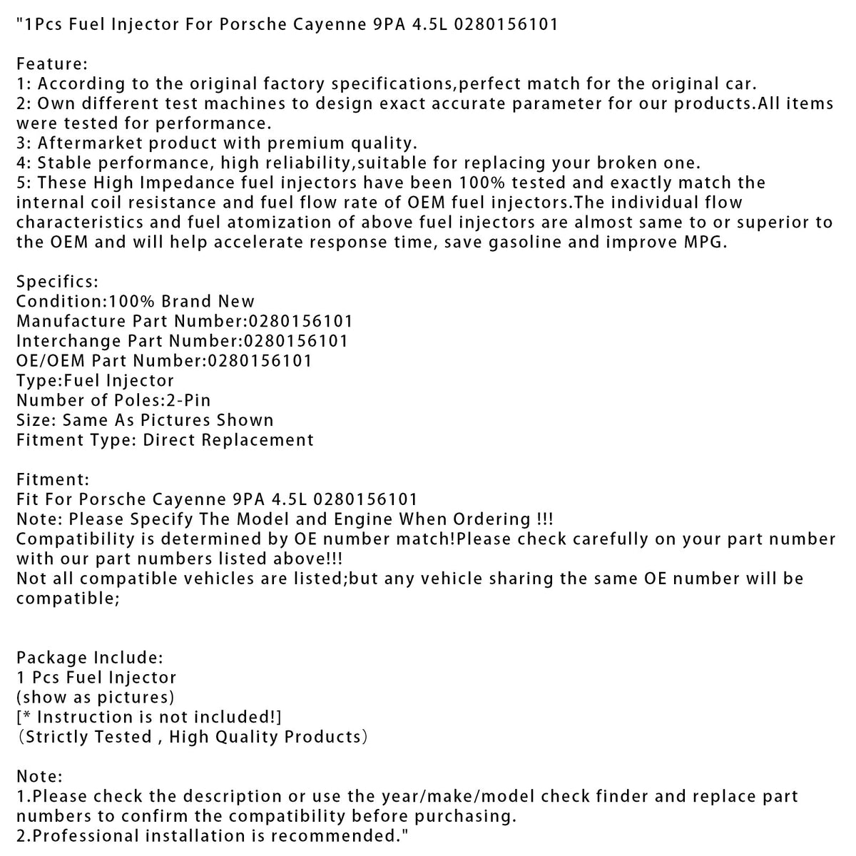 ポルシェ カイエン 9PA 4.5L 0280156101 用燃料インジェクター 1個