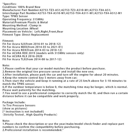 ACURA RDX 2019に適合(315MHzセンサー搭載モデルのみ)