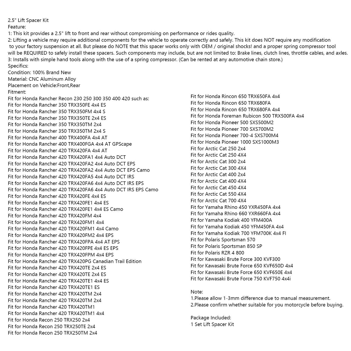 2: 車両を持ち上げると、車両が正しく安全に作動するために追加のコンポーネントが必要になる場合があります。このキットでは、工場出荷時のサスペンションを変更する必要はまったくありません。ただし、このスペーサーは OEM / オリジナル ショックでのみ機能することに注意してください。また、これらのスペーサーを安全に設置するには、適切なスプリング コンプレッサー ツールが必要になります。このようなコンポーネントには、ブレーキ ライン、クラッチ ライン、スロットル ケーブル、車軸などが含まれますが、これらに限定されません。