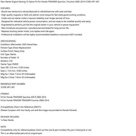 新しいスターターエンジン始動 10 スプライン ホンダ TRX450ER Sportrax / Fourtrax 2006-2014 31200-HP1-601 に適合