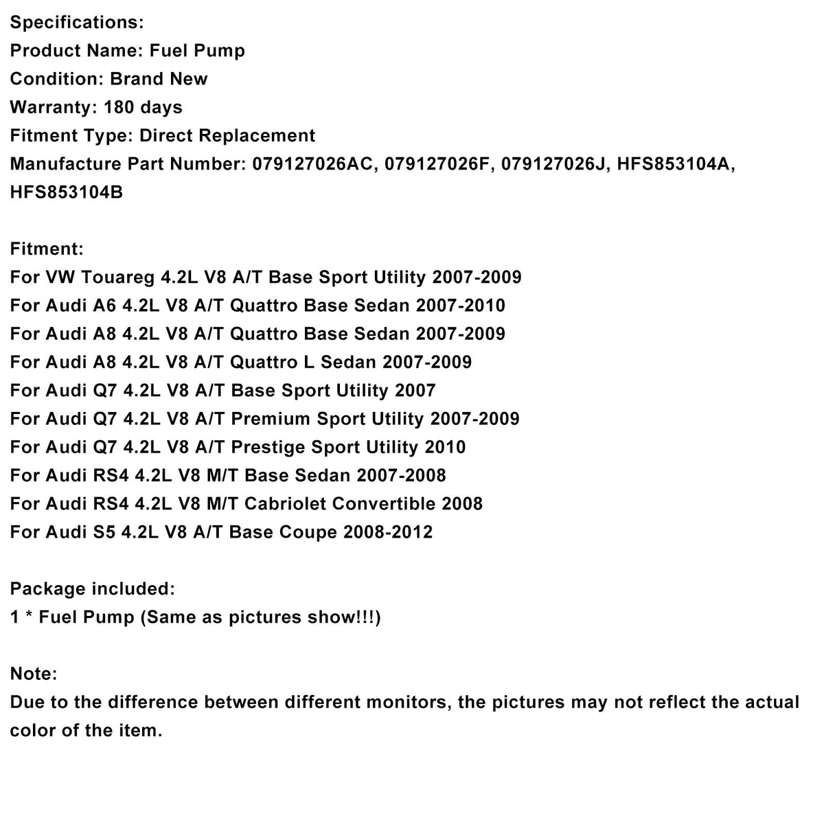 2007-2009 Audi Q7 4.2L V8 A/T プレミアム スポーツユーティリティ 右高圧燃料ポンプ 079127026AC