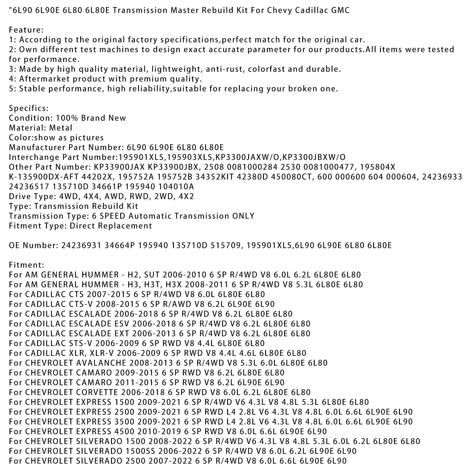OE番号: 24236931 34664P 195940 135710D 515709, 195901XLS,6L90 6L90E 6L80 6L80E