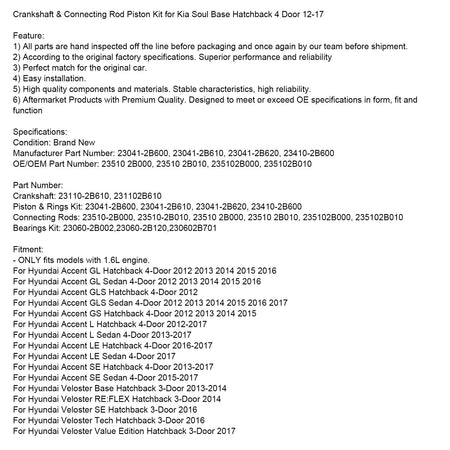 クランクシャフト&コネクティングロッドピストンキット Kia Soul Base ハッチバック 4ドア 12-17 に適合
