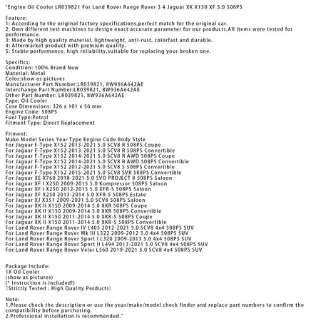エンジンオイルクーラー LR039821 ランドローバー レンジローバー 3 4 ジャガー XK X150 XF 5.0 508PS用