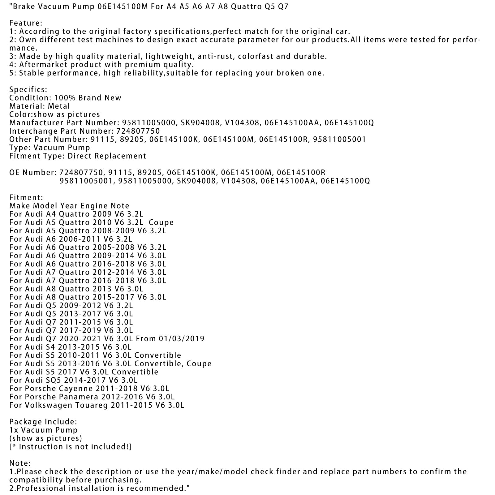 ブレーキ真空ポンプ 06E145100M A4 A5 A6 A7 A8 クワトロ Q5 Q7用