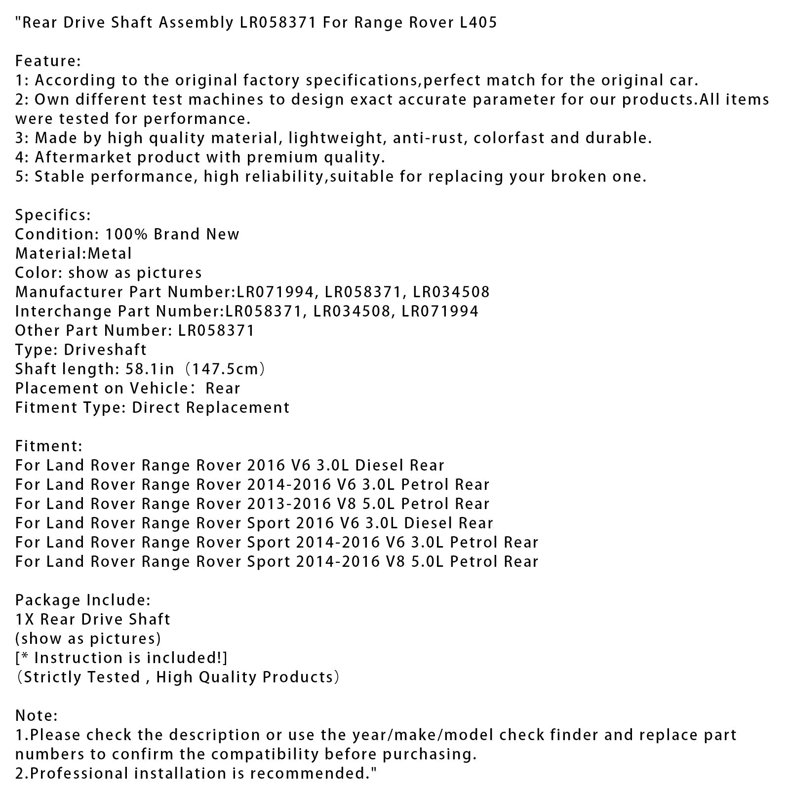 2013-2016 ランドローバー レンジローバー V8 5.0L ガソリン リアドライブシャフトアセンブリ LR058371 LR034508