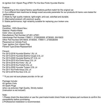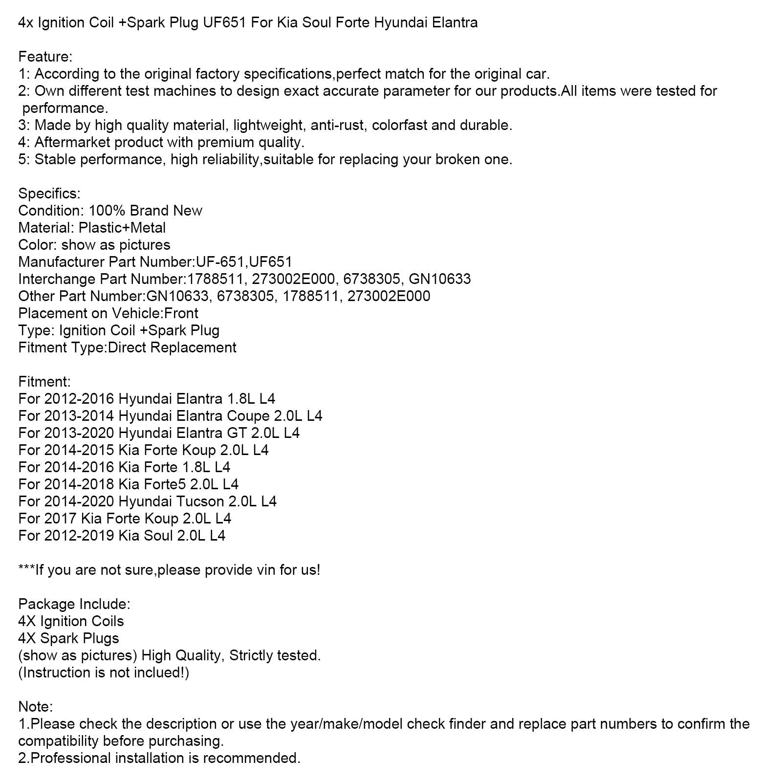 4xイグニッションコイル+スパークプラグUF651 Kia Soul Forte Hyundai Elantraに適合