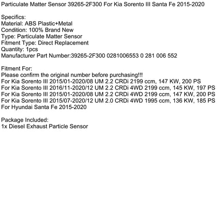 2016/11-2020/12 Kia ソレント III UM 2.2 CRDi 4WD 2199 ccm 粒子状物質センサー 39265-2F300 0281006553