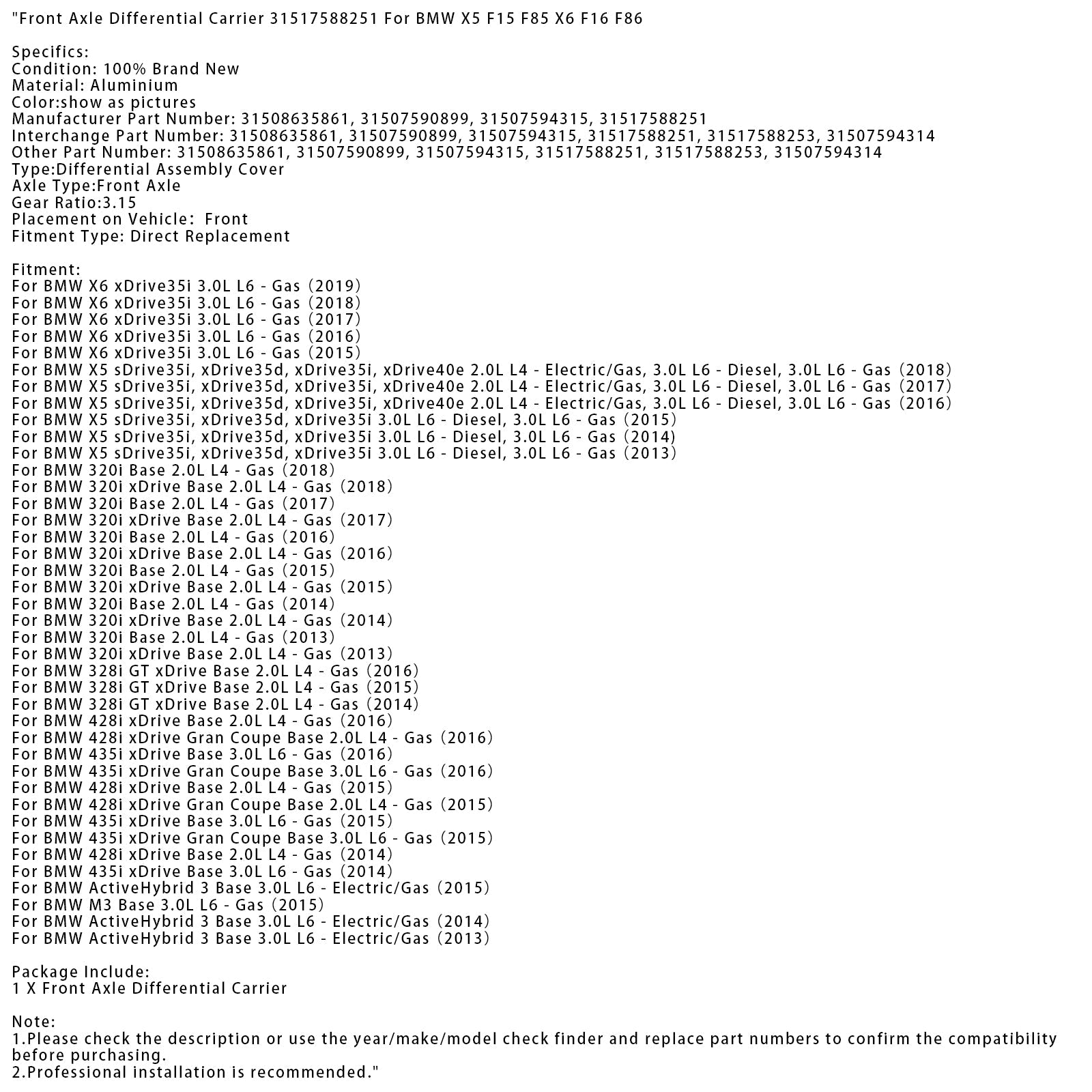 フロントアクスルディファレンシャルキャリア 31517588251 BMW X5 F15 F85 X6 F16 F86用