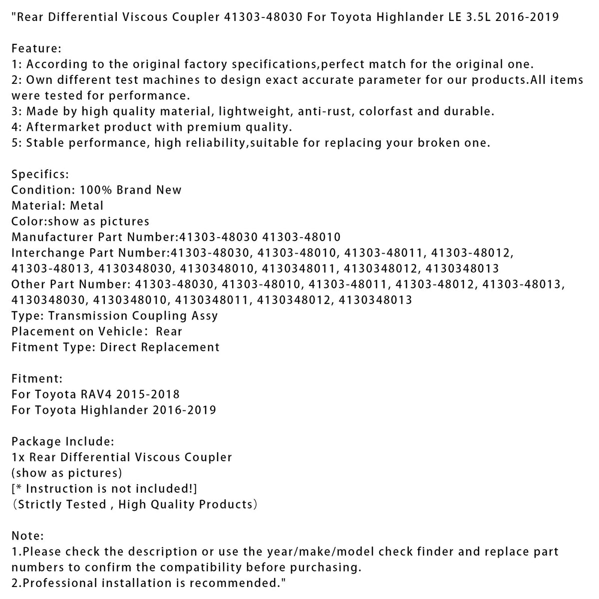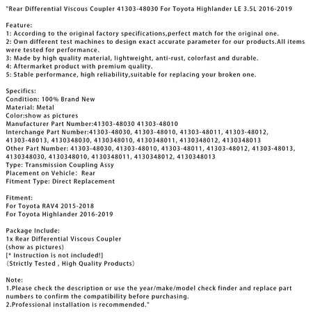 リアディファレンシャルビスカスカプラー 41303-48030 トヨタ ハイランダー LE 3.5L 2016-2019用