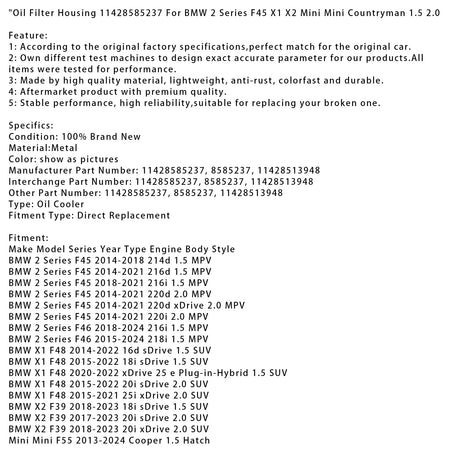 オイルフィルターハウジング 11428585237 BMW 2シリーズ F45 X1 X2 Mini Mini Countryman 1.5 2.0用