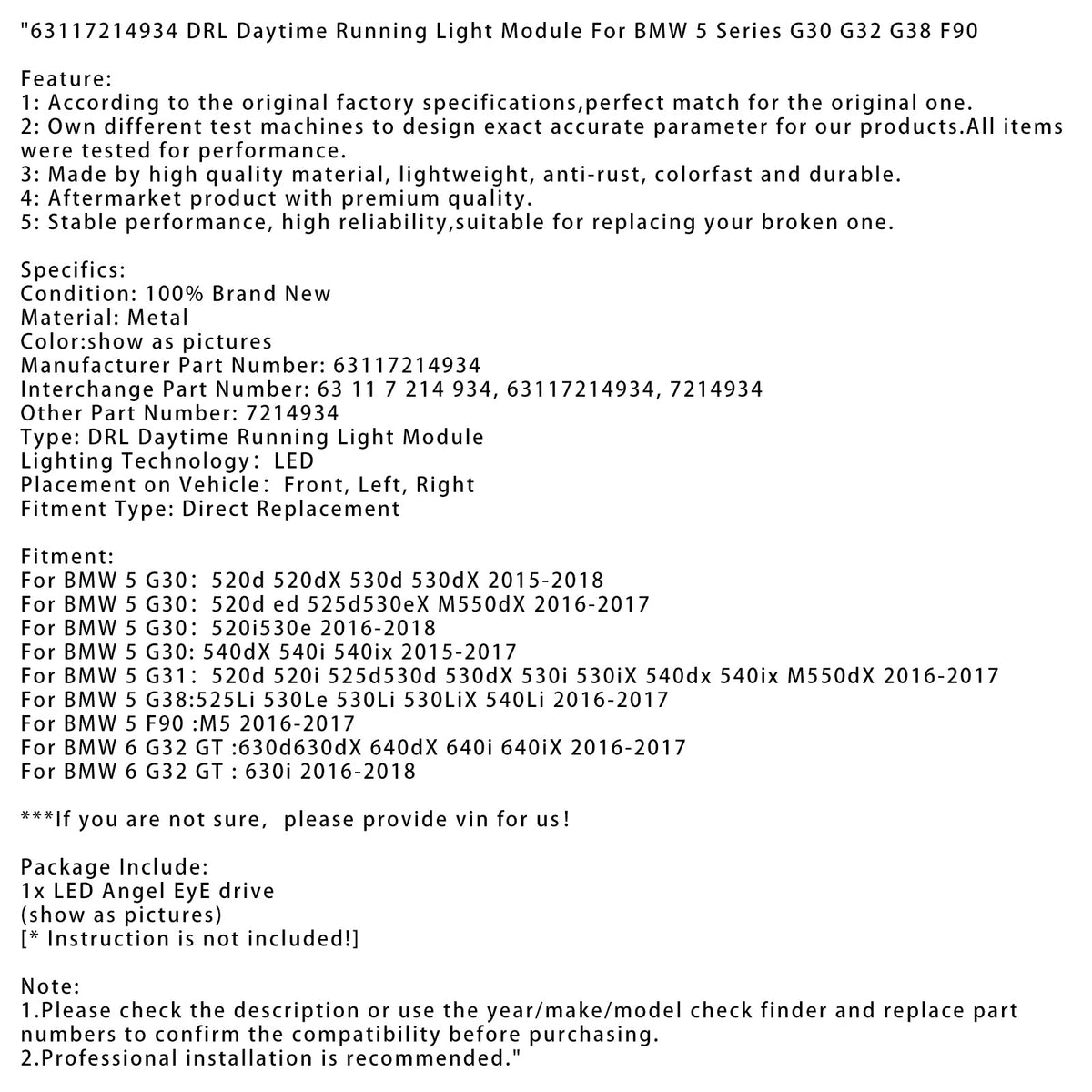 BMW 6 G32 GT:630d630dX 640dX 640i 640iX 2016-2017 DRL デイタイムランニングライトモジュール 63117214934