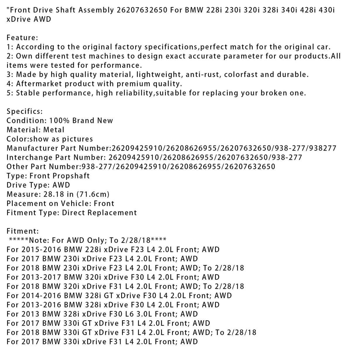 フロントドライブシャフトアセンブリ 26207632650 BMW 228i 230i 320i 328i 340i 428i 430i xDrive AWD用