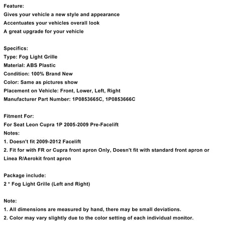 2. FRまたはCupraフロントエプロンのみに適合します。標準フロントエプロンまたはLinea R / Aerokitフロントエプロンには適合しません。