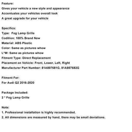 2PCS フロントバンパーグリル フォグランプグリル 81A807681G Audi Q2 2016-2020に適合