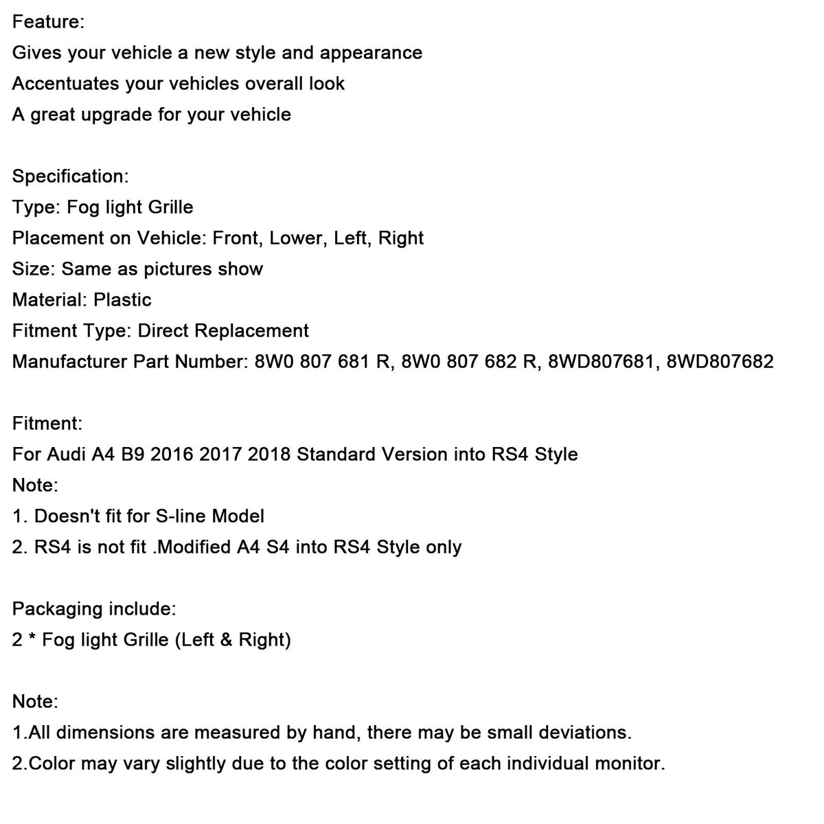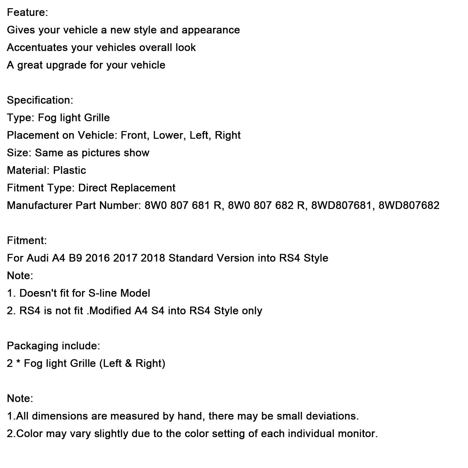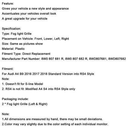 フロントフォグランプグリル 下部バンパーグリル 2個 AUDI A4 B9 2016-2018に適合