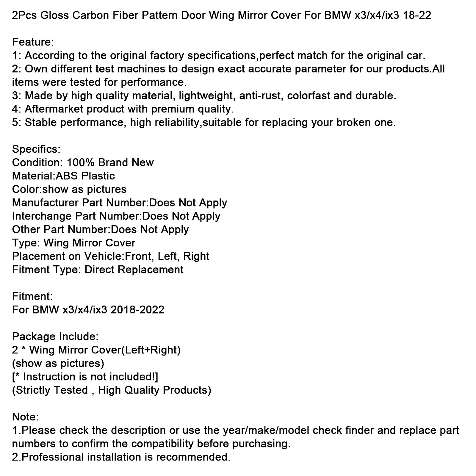 2個入り グロスカーボンファイバーパターン ドアウィングミラーカバー BMW x3/x4/ix3 2018-2022年式対応