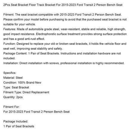 適合:このシートブラケットは、2015~2023年式のフォード・トランジット2人乗りベンチシートに適合します。ご購入前に、お車のモデルをご確認ください。ご購入いただいたシートブラケットがお客様の車両に適合しない可能性があります。
