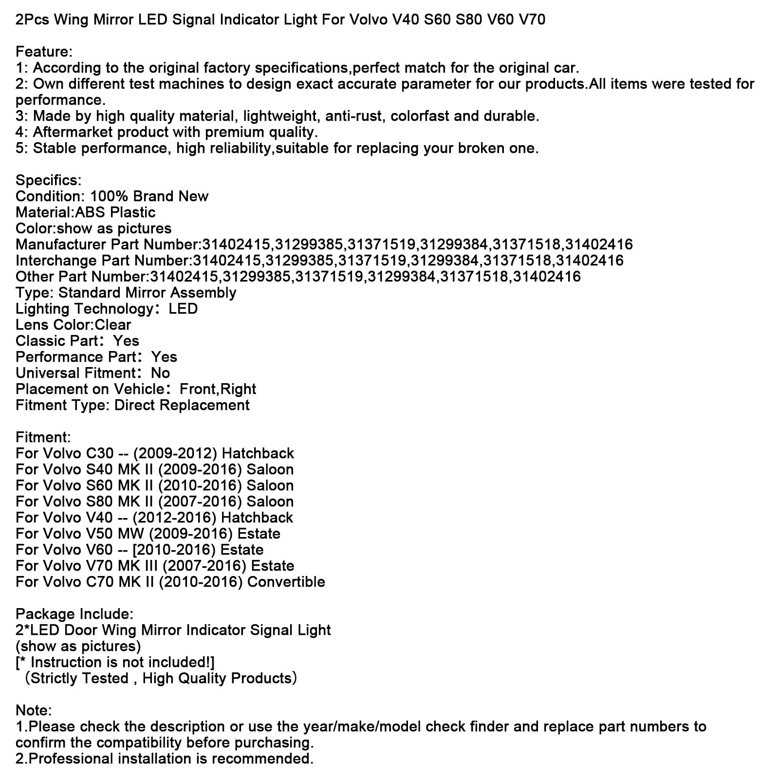 メーカー部品番号:31402415,31299385,31371519,31299384,31371518,31402416