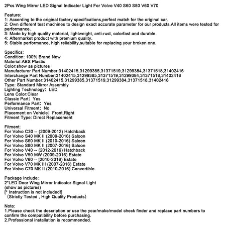 ボルボ V40 S60 S80 V60 V70用 2個入り ドアミラーLEDシグナルインジケーターライト