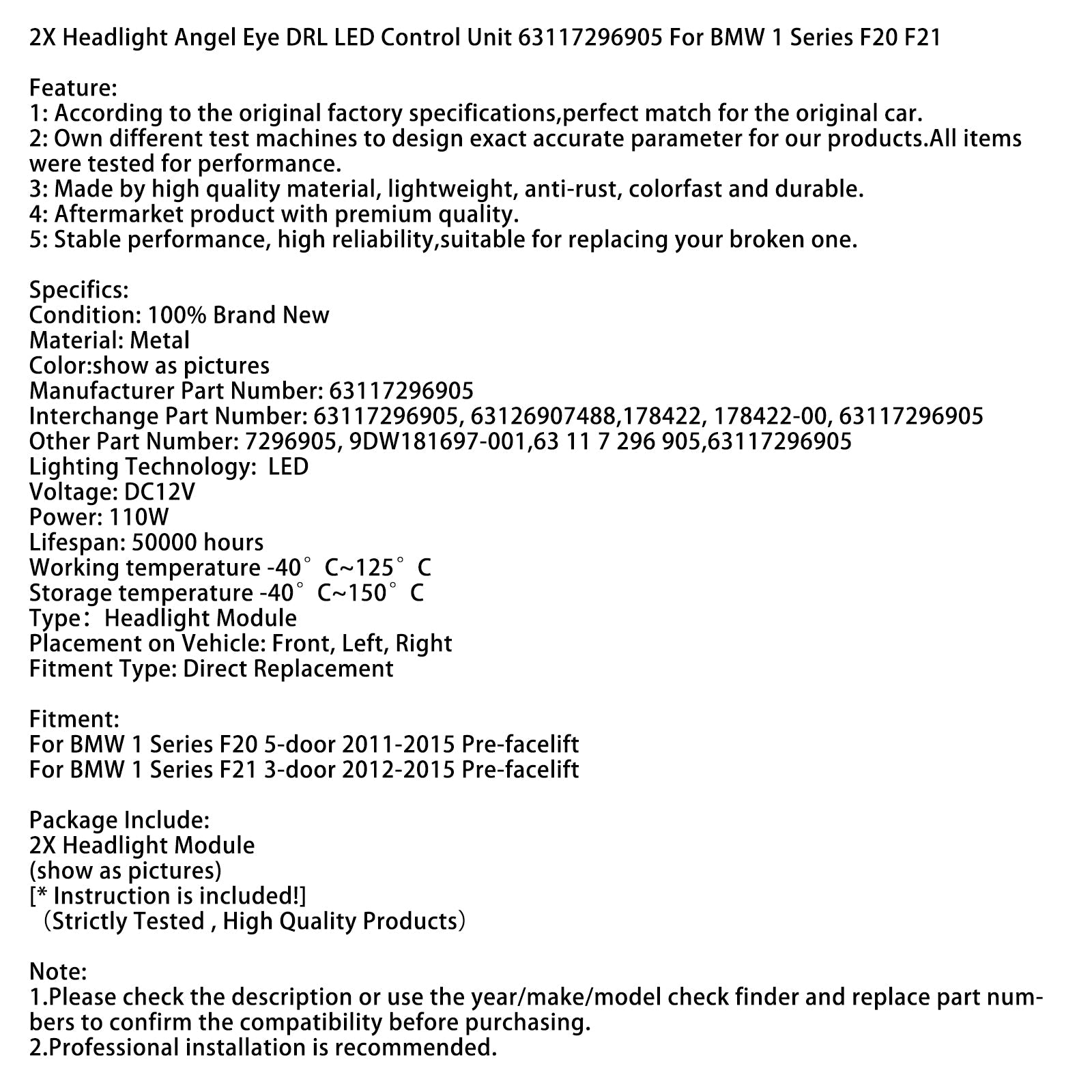 2X ヘッドライト エンジェルアイ DRL LED コントロールユニット 63117296905 BMW 1シリーズ F20 F21用