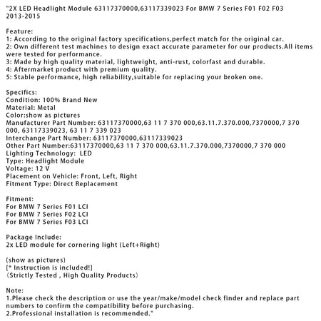 2X LEDヘッドライトモジュール 63117370000,63117339023 BMW 7シリーズ F01 F02 F03 2013-2015用