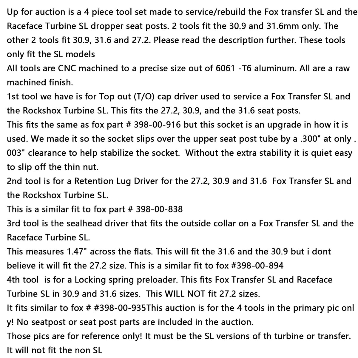 出品するのは、FoxトランスファーSLおよびRaceface Turbine SLドロッパーシートポストの修理/リビルド用に作られた4点ツールセットです。2つのツールは30.9mmと31.6mmにのみ適合します。他の2つのツールは30.9mm、31.6mm、27.2mmに適合します。詳細は説明をご覧ください。これらのツールはSLモデルにのみ適合します。