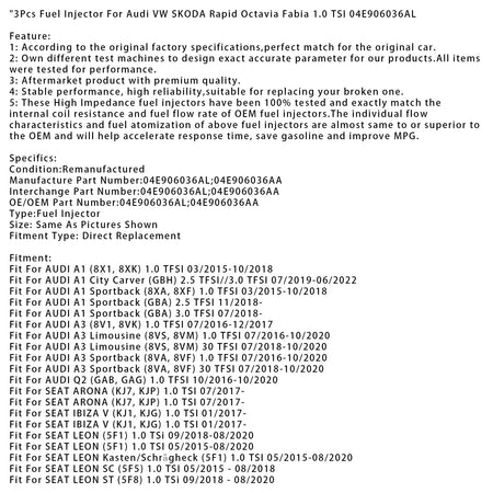 Audi VW SKODA Rapid Octavia Fabia 1.0 TSI 04E906036AL用 燃料インジェクター 3個