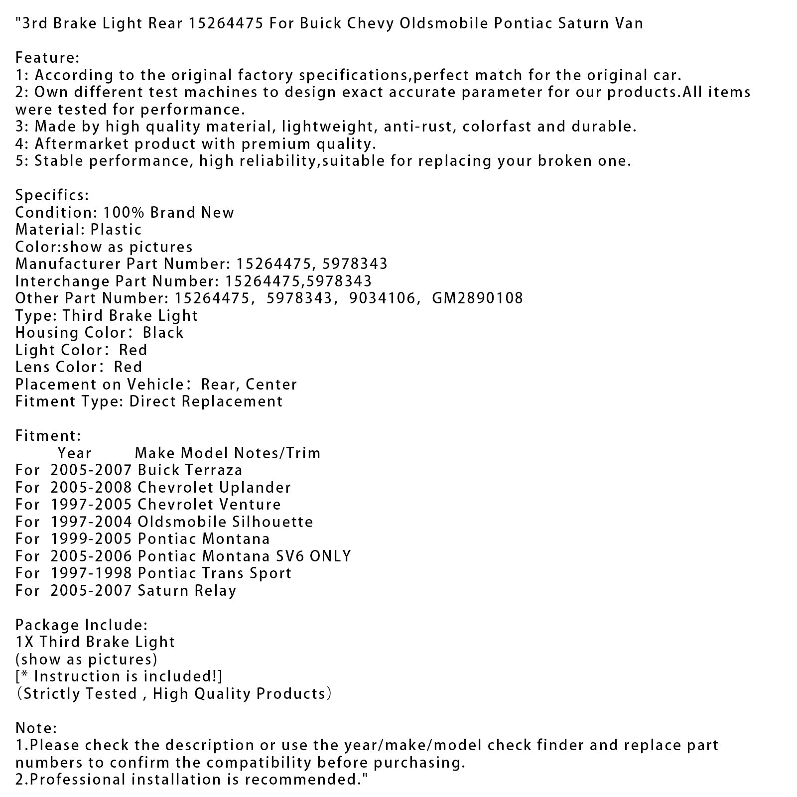 3rdブレーキライトリア15264475ビュイックシボレーオールズモビルポンティアックサターンバン用