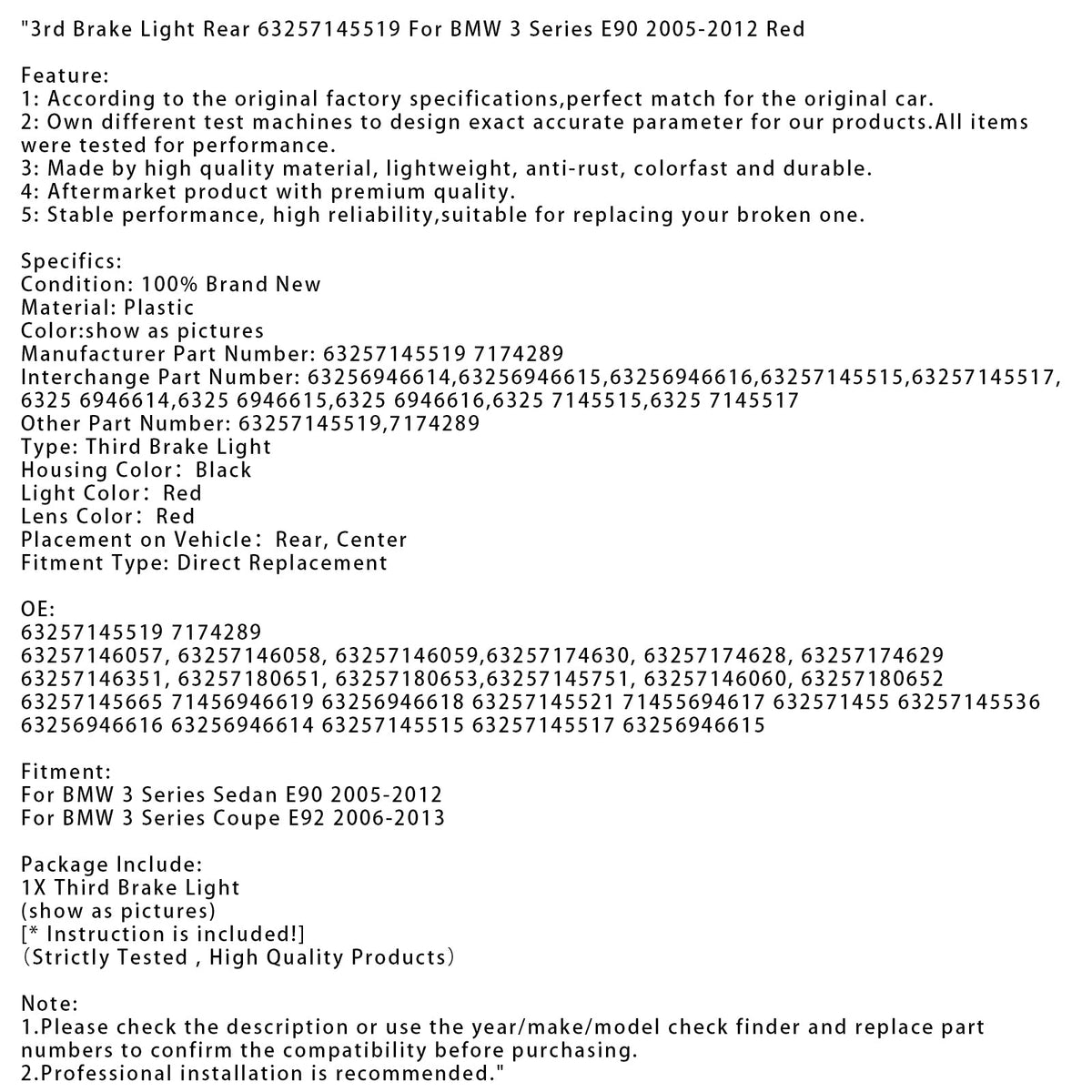3rdブレーキライト リア 63257145519 BMW 3シリーズ E90 2005-2012 レッド