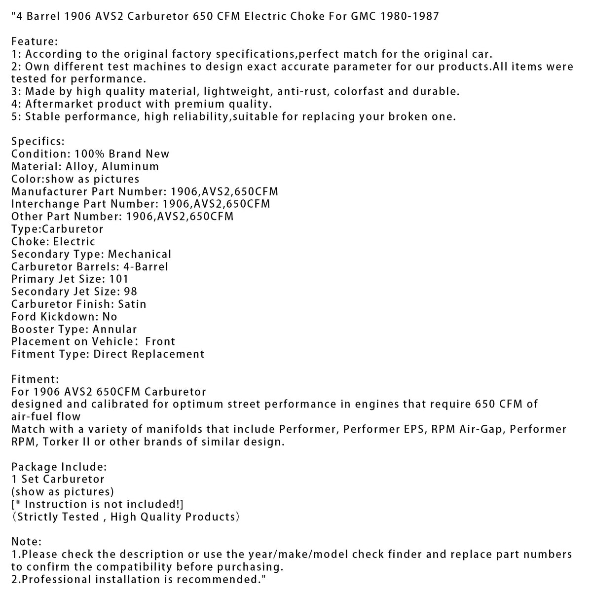 4バレル 1906 AVS2 キャブレター 650 CFM 電動チョーク GMC 1980-1987用
