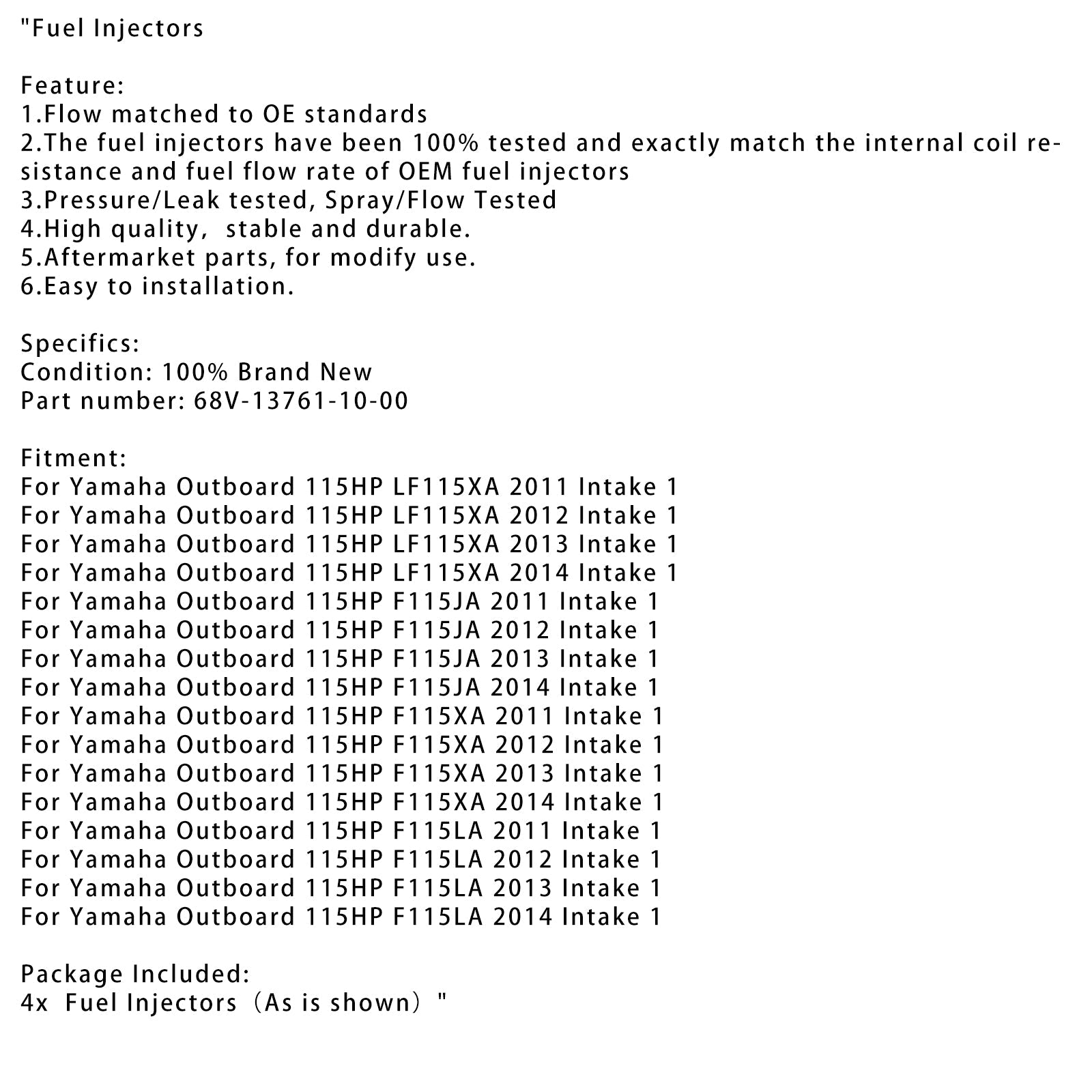 4PC 68V-13761-10-00 燃料インジェクター ヤマハ船外機 115HP F115JA F115LA 11-14用