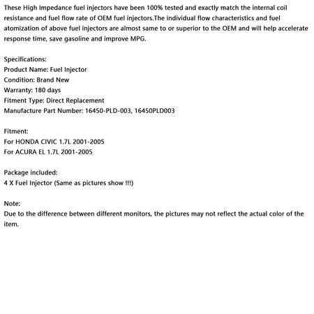 4個入り燃料インジェクター 16450-PLD-003 ACURA EL ホンダ シビック 1.7L 2001-2005に適合