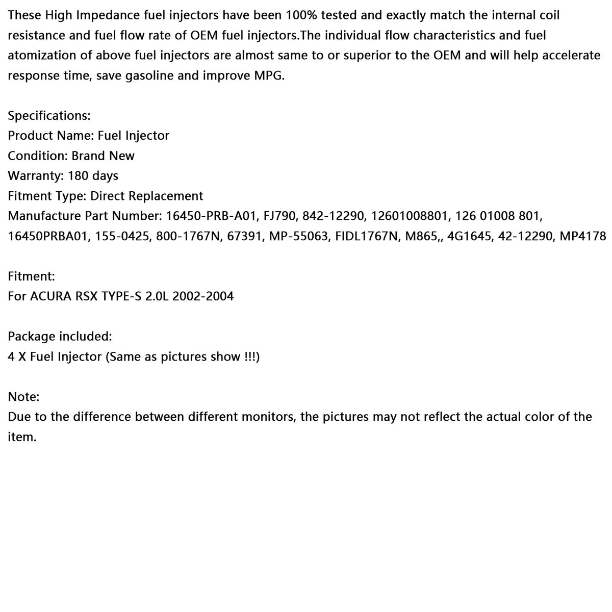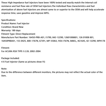 4個入り 燃料インジェクター 16450-PRB-A01 適合 Acura RSX TYPE-S 2.0L 2002-2004 842-12290