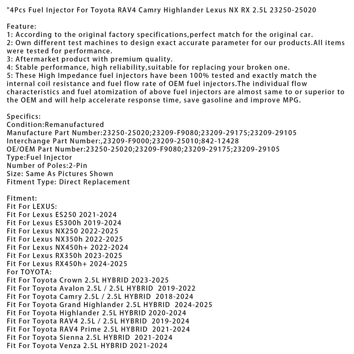トヨタ RAV4 カムリ ハイランダー レクサス NX RX 2.5L 23250-25020 用 燃料インジェクター 4個