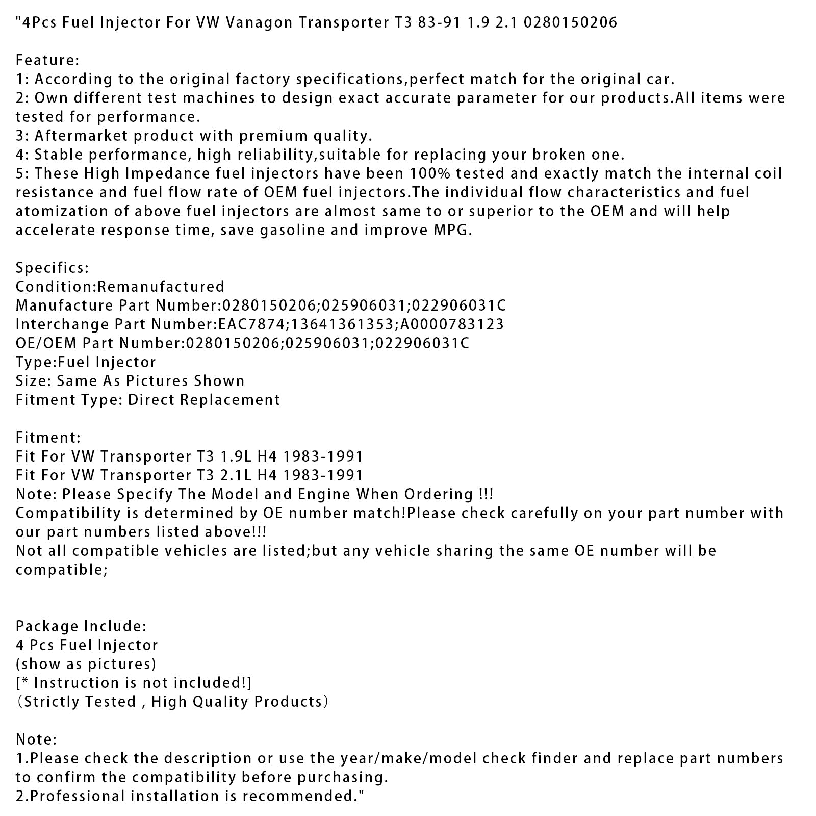 VW ヴァナゴン トランスポーター T3 83-91 1.9 2.1 0280150206 用 燃料インジェクター 4個